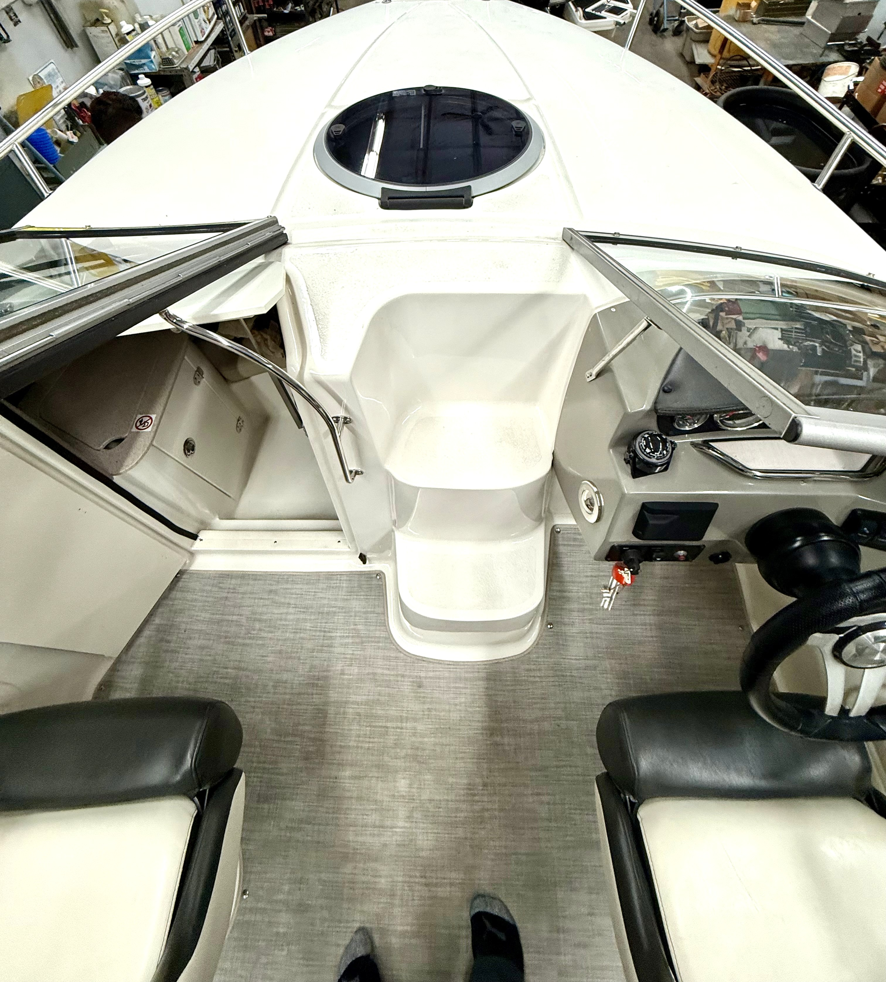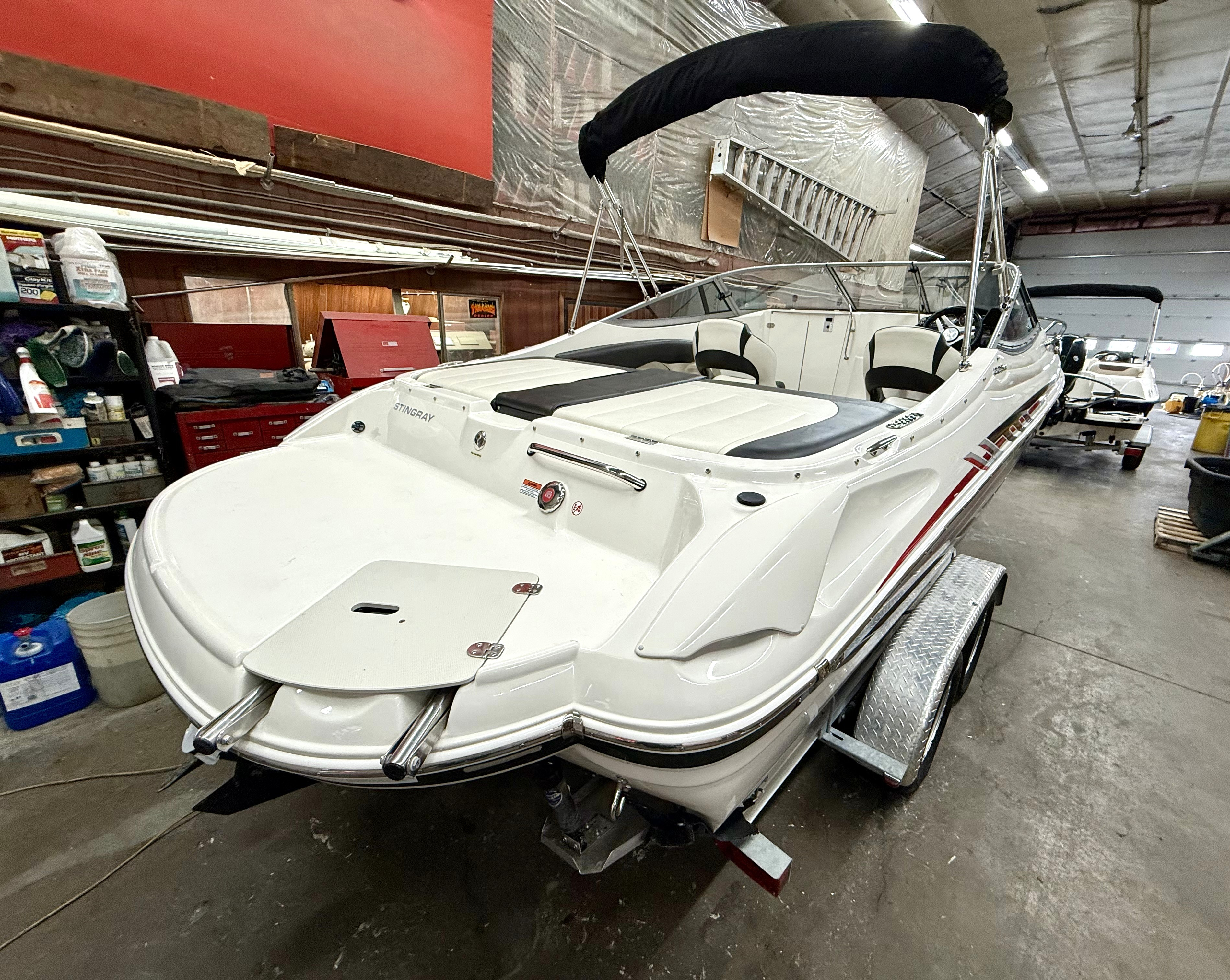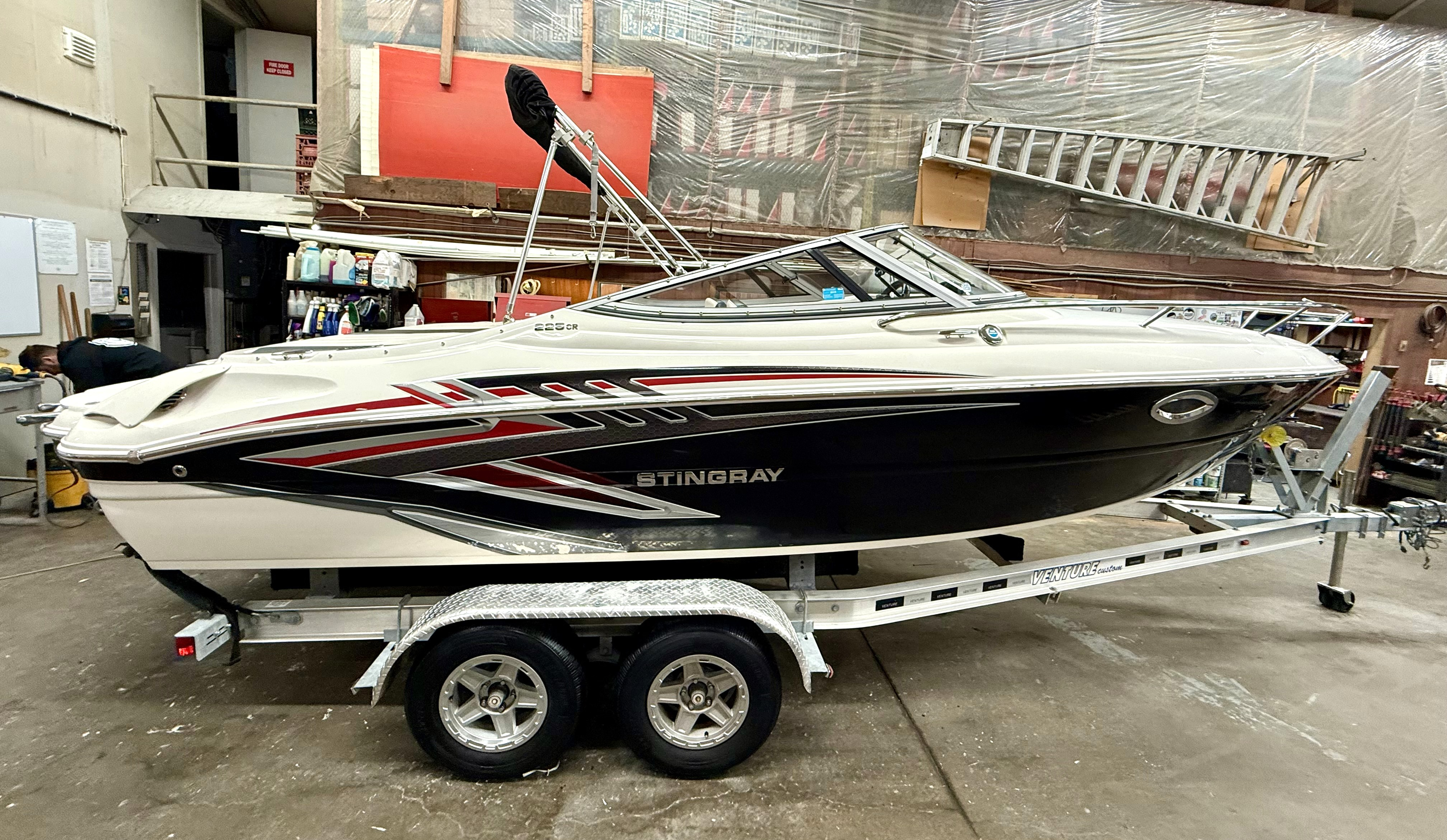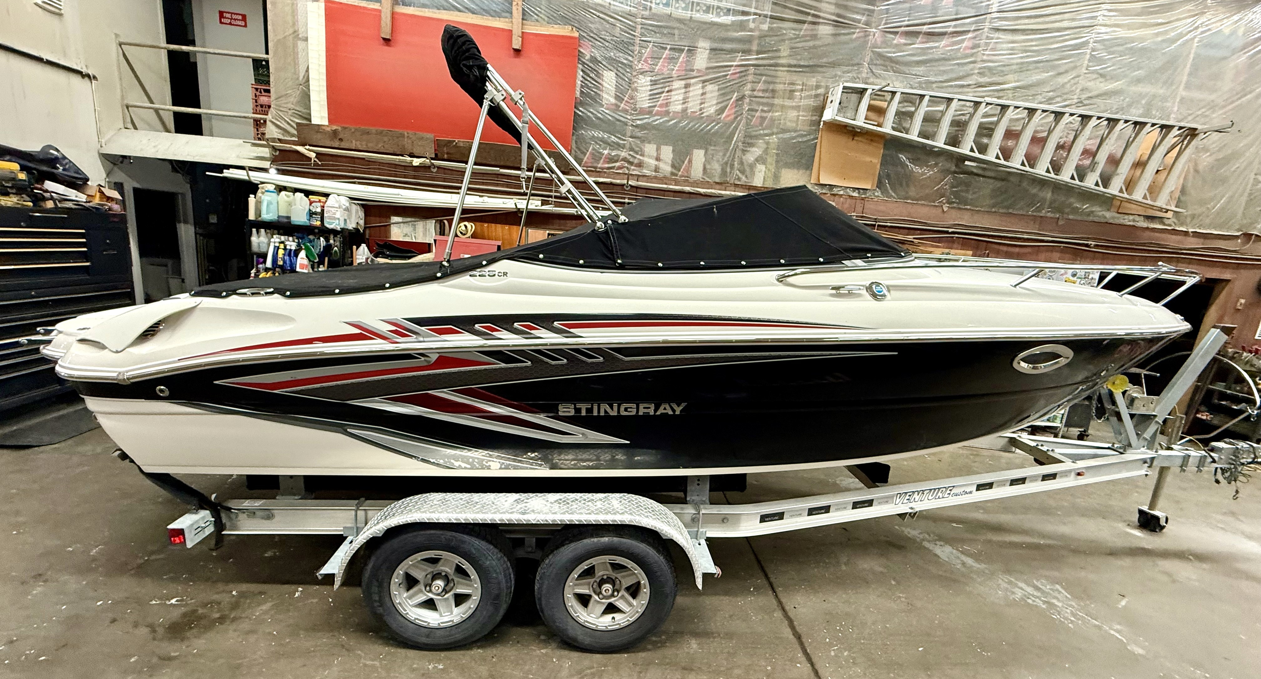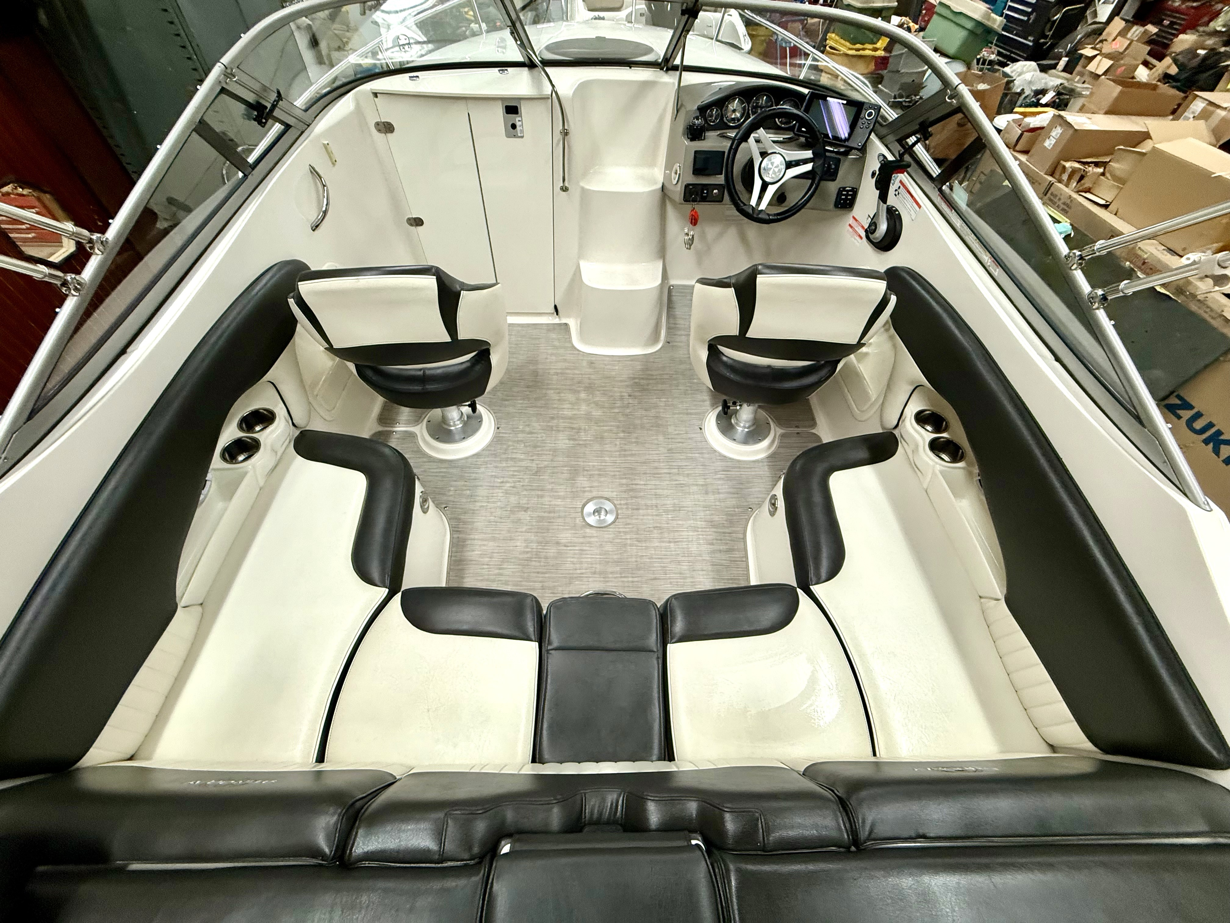Very clean, one owner, ONLY 38 hours! 4.5L 250hp Mercruiser, sun sport interior, dual bucket seats with flip up bolsters, deluxe steering wheel, stereo, GPS, trim tabs, snap out carpet, table kit, cooler, Head, sink, walk thru windshield, bimini top enclosure, cockpit cover, Venture tandem axle trailer