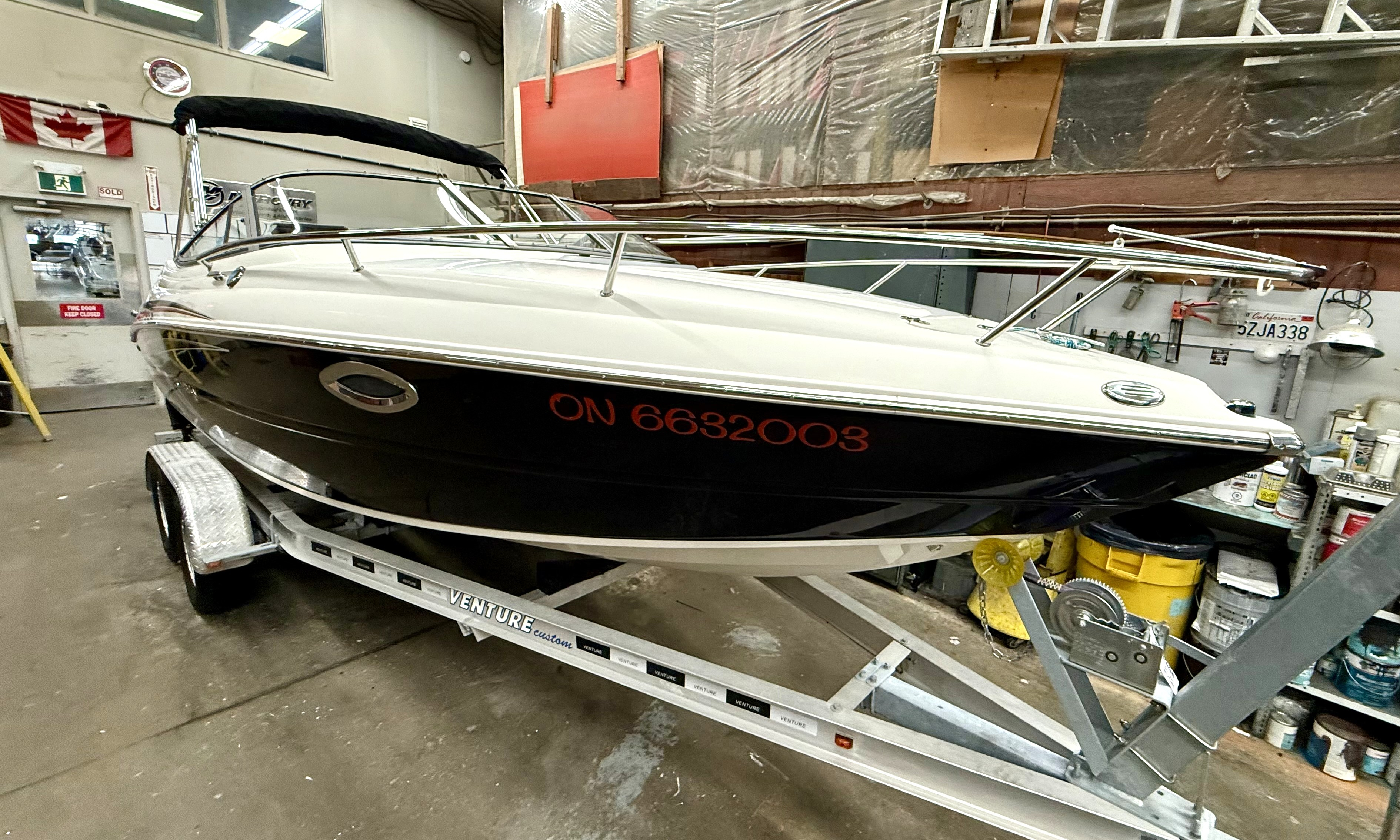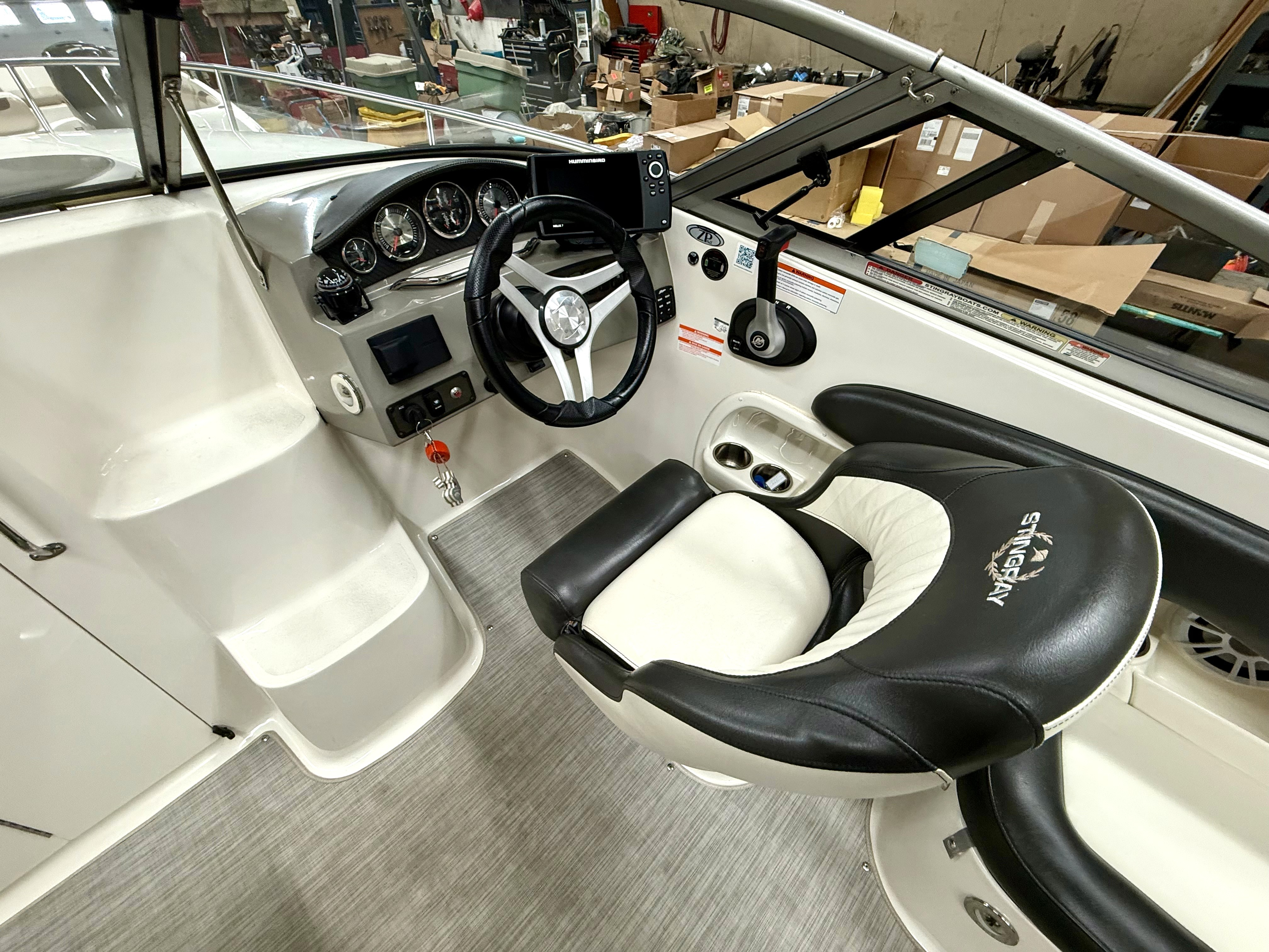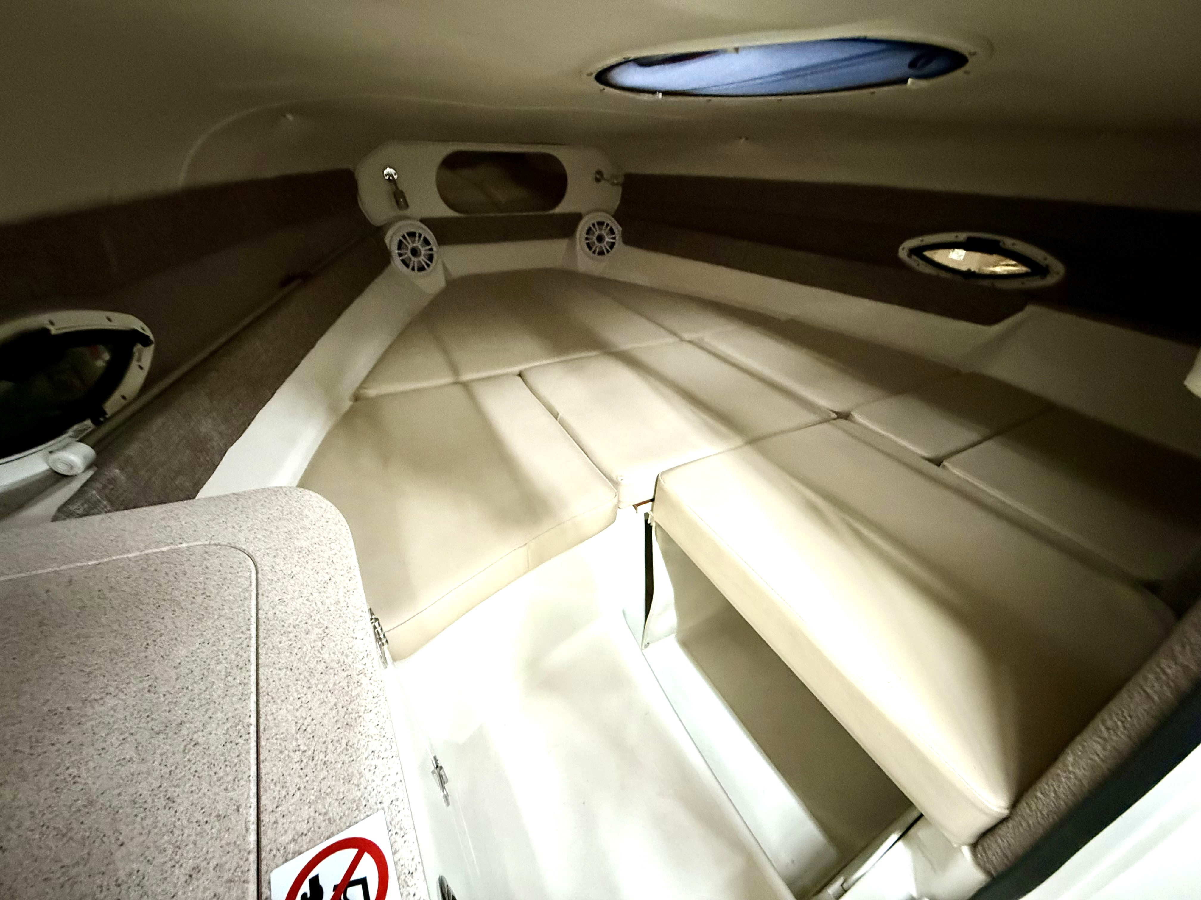 Very clean, one owner, ONLY 38 hours! 4.5L 250hp Mercruiser, sun sport interior, dual bucket seats with flip up bolsters, deluxe steering wheel, stereo, GPS, trim tabs, snap out carpet, table kit, cooler, Head, sink, walk thru windshield, bimini top enclosure, cockpit cover, Venture tandem axle trailer